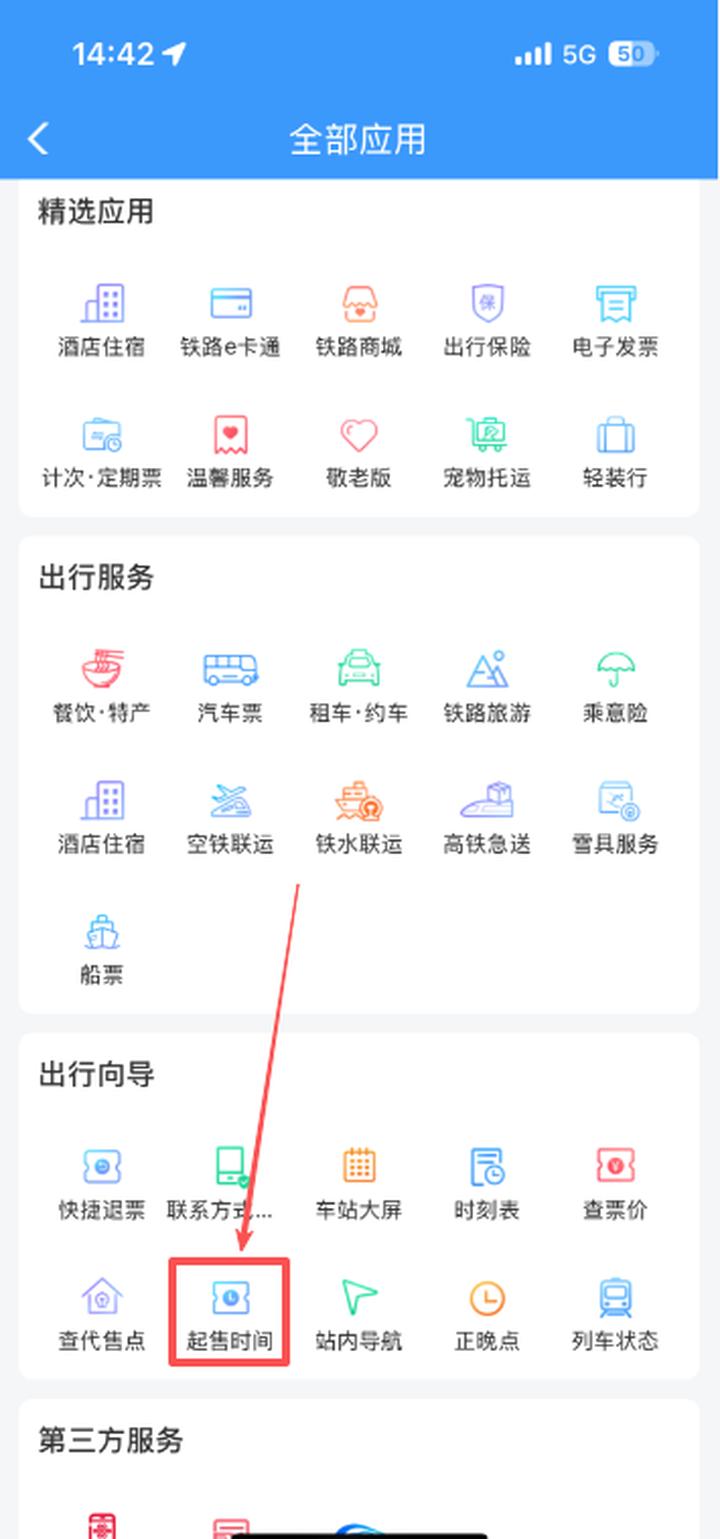 打开【铁路12306】APP,如图框选区域向左滑动,滑动后跳转至第二页,点击“起售时间”。