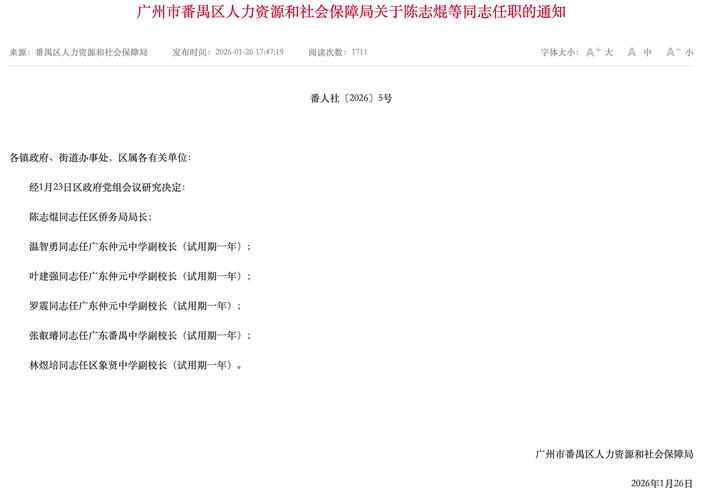 近日,广州市番禺区人民政府官网发布《广州市番禺区人力资源和社会保障局关于陈志焜等同志任职的通知》。通知显示,广东仲元中学、广东番禺中学、象贤中学3所学校迎来新副校长。