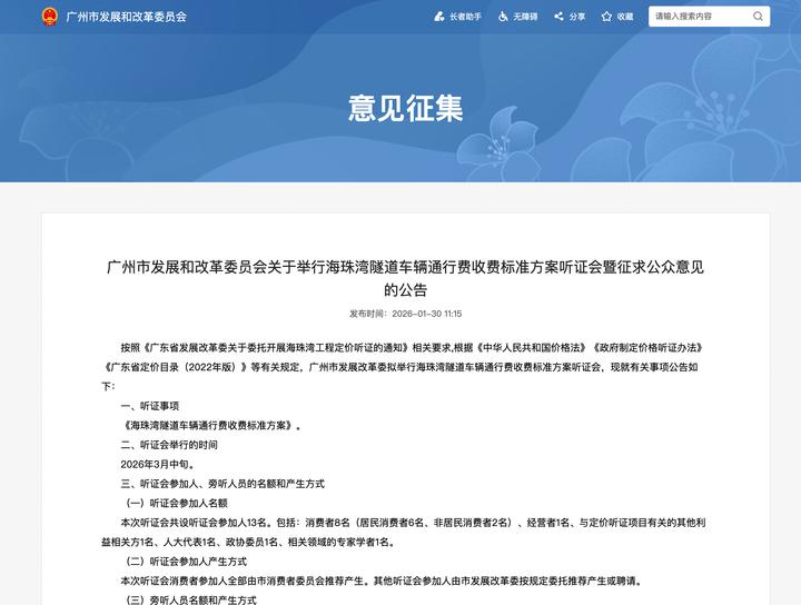 1月30日,广州市发改委发布消息,海珠湾隧道车辆通行费收费标准方案听证会将于2026年3月中旬召开,此次听证会将对海珠湾隧道车辆通行费收费标准两套方案进行讨论,方案一收费标准为15元/标准车次,方案二收费标准为13元/标准车次。