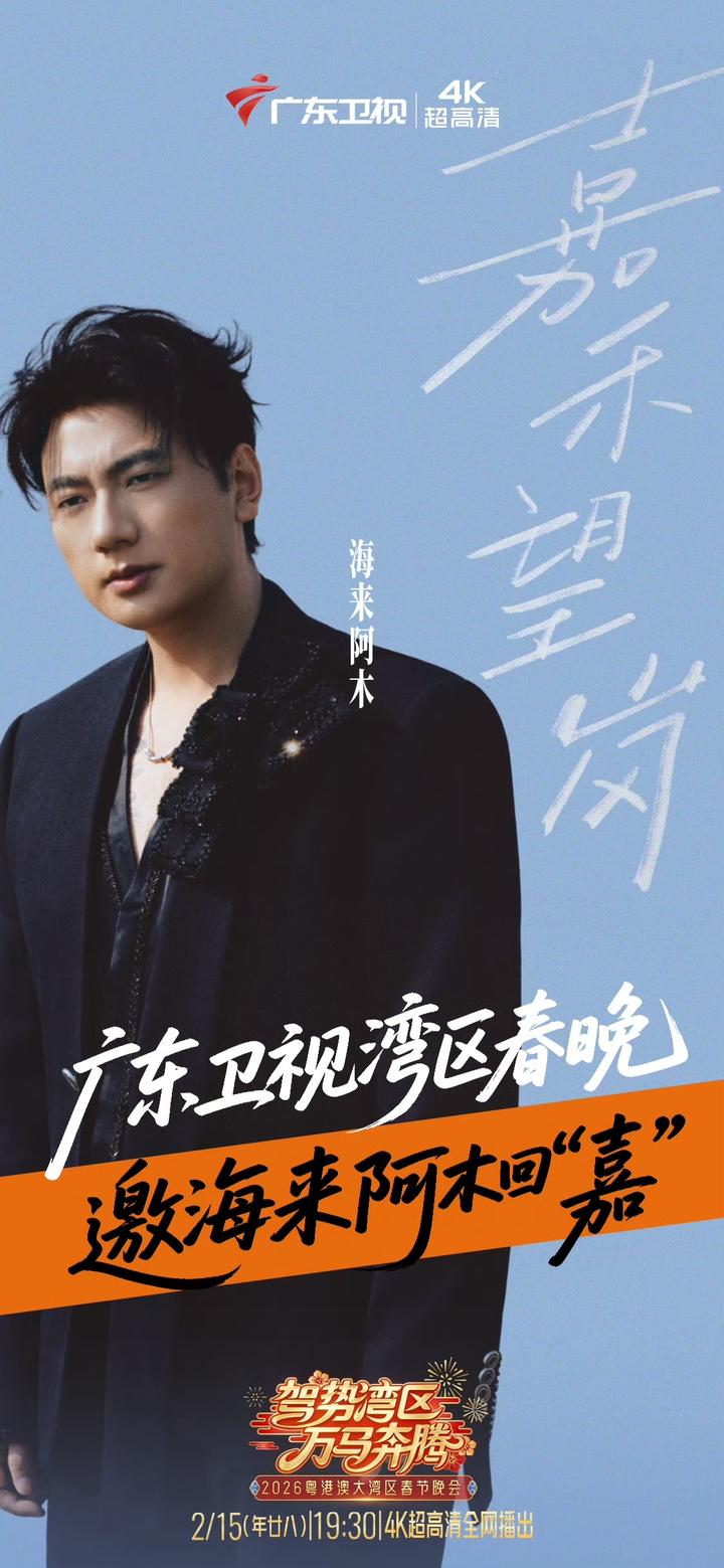 1月30日,广东卫视官宣知名歌手海来阿木将携《嘉禾望岗》登上《驾势湾区 万马奔腾——2026粤港澳大湾区春节晚会》:
