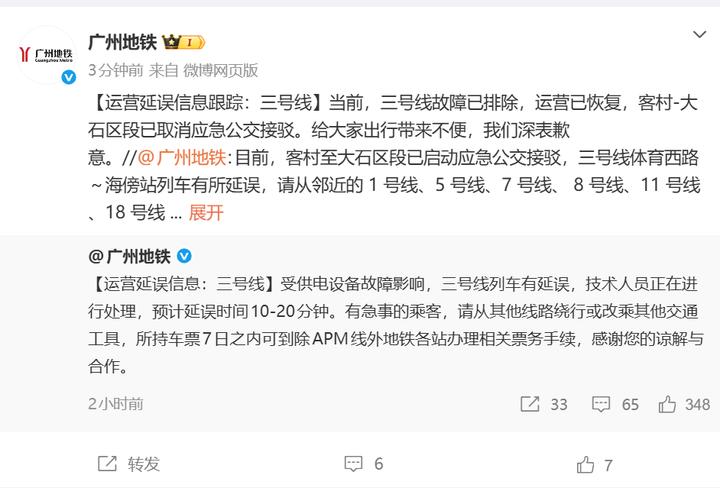 此前,2月1日22时27分,@广州地铁发布消息称,受供电设备故障影响,三号线列车有延误,技术人员正在进行处理,预计延误时间10-20分钟。有急事的乘客,请从其他线路绕行或改乘其他交通工具,所持车票7日之内可到除APM线外地铁各站办理相关票务手续,感谢您的谅解与合作。