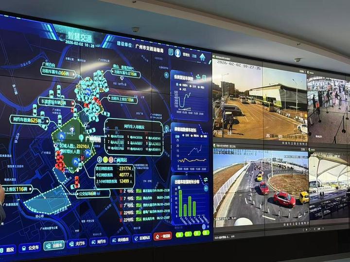 2月2日,在广州市交通信息指挥中心,智慧交通系统大屏上闪烁着各个交通枢纽的客流情况。今年,白云机场T3航站楼首次投入春运,智慧交通系统接入了T3航站楼的航班客流、周边交通运力、新开通道路等实时数据,并整合了相关视频资源。