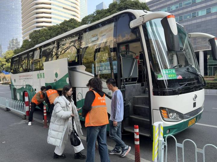 2月2日上午,在珠江新城A1口附近,多班前往肇庆、珠海、中山的大巴停靠上下客。乘客周小姐在停靠点等车,准备前往珠海,她说:“我在网上买票,大巴停靠点就在地铁口附近,坐地铁出站后就能搭上车,不用再前往传统的客运站等车,方便快捷。”