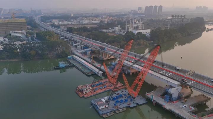 东洲河大桥横跨东江Ⅱ级航道,全长415米,采用两侧拼宽、旧桥拆除重建的建设方案,是项目体量最大的钢结构通航桥。本次架设的首片钢混组合梁长58米、重96吨。