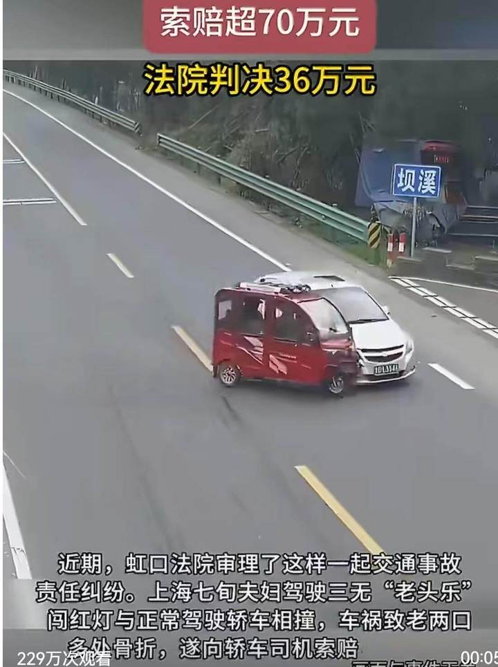 近日,上海一起交通事故判决引发全网热议:七旬夫妇驾驶无牌、无证、无保险的“三无”老头乐闯红灯,与正常绿灯行驶的轿车相撞,老两口多处骨折,其后索赔70余万元,法院最终核定赔偿36万元。