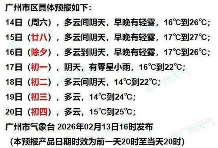 广州市气象台预计,2月14日—16日广州多云间阴天,早晚有轻雾,气温大致平稳。