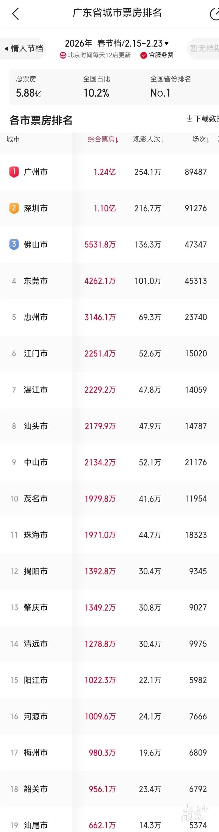 据猫眼专业版APP统计,2026年春节档,广东省以5.88亿元总票房,稳居全国省份票房榜首,湛江以2229.2万元的综合票房,居全省第七,粤东西北第一,观影人次达到47.8万。