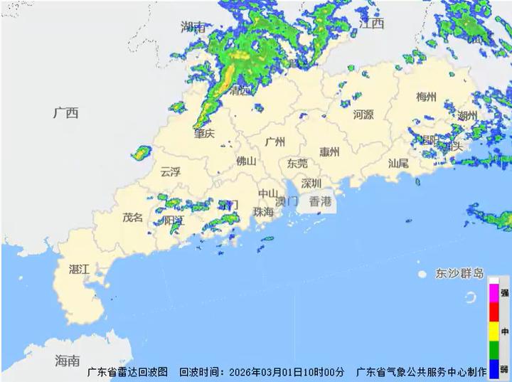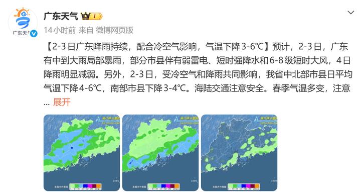 省气象台预计,2-3日,广东有中到大雨局部暴雨,部分市县伴有弱雷电、短时强降水和6-8级短时大风,4日降雨明显减弱。另外,2-3日,受冷空气和降雨共同影响,我省中北部市县日平均气温下降4-6℃,南部市县下降3-4℃。