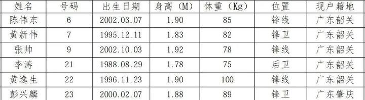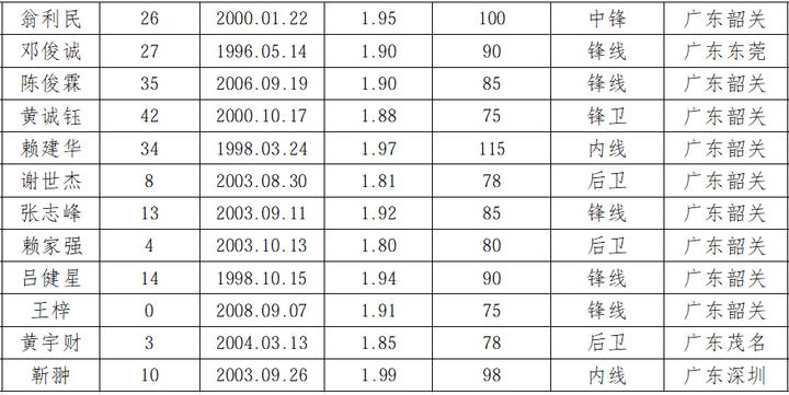 韶关队报名名单