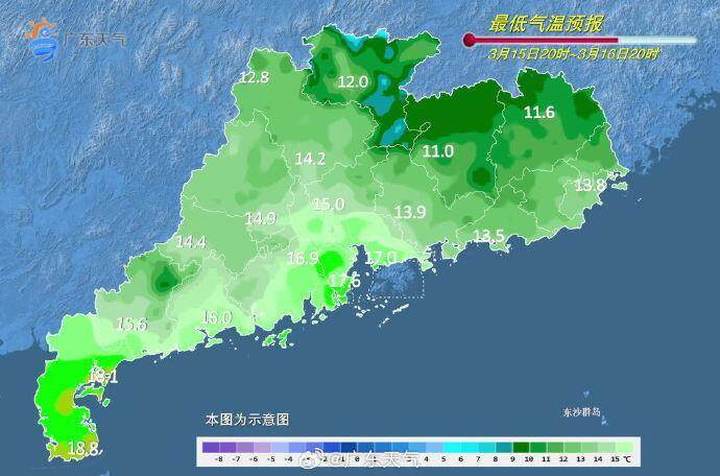 3月15-16日,西部市县多云,其余市县晴到多云。15日早晨最低气温:河源、梅州、惠州、粤东市县8℃~11℃,珠江口附近和粤西沿海市县16℃~20℃,其余大部分市县11℃~16℃。16日最低气温小幅回升。