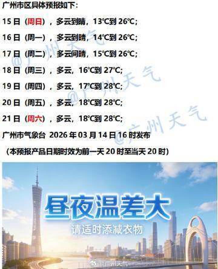 广州未来一周的天气,主打一个“昼暖夜凉温差大”。广州市气象台预测,3月15日至17日云量略增,最低气温逐渐回升,最高温可达26℃;3月18日至21日以多云为主,最高气温将飙升至28℃——短袖可以准备起来了。