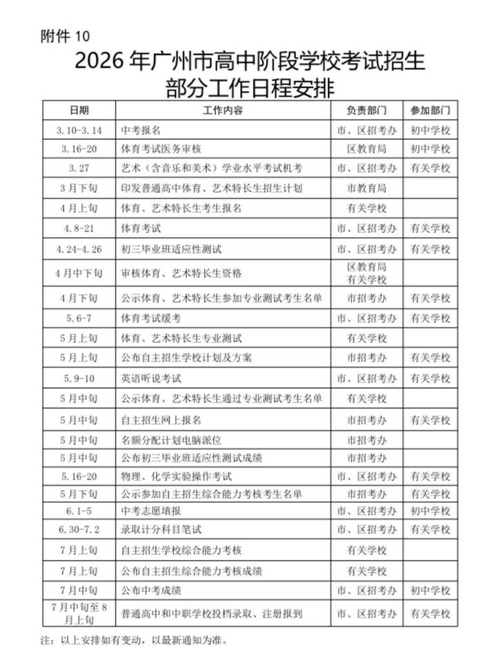 2026年广州中考报名已经结束,意味着长达近半年的中考流程开始,包括报名、体育中考、上机考试、填报志愿、录取等诸多环节,哪些时间节点需要做什么?《隽言教育》一一梳理。