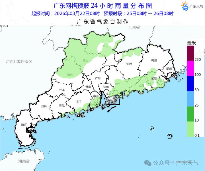 25日,韶关和清远市县阴天间多云,有小雨,河源及梅州的北部、珠江三角洲北部市县多云到阴天,有分散小雨,其余市县多云间阴天局部有零星小雨,大部市县早晚有轻雾或雾。最高气温:韶关和清远市县21~24℃,其余大部市县26~29℃。