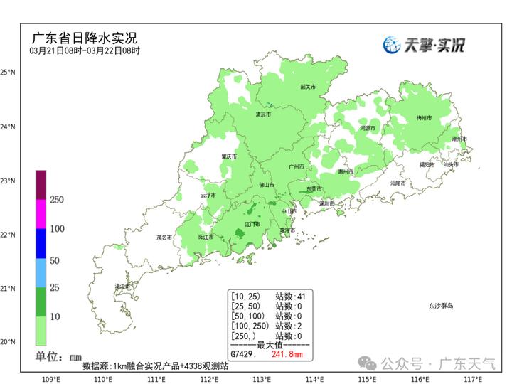 21日白天到22日早晨,粤北、珠江三角洲、阳江、云浮等市县阴天,出现了小雨和轻雾或雾,其中江门市县局部出现了中雨,江门、珠海、佛山、广州、肇庆、清远、韶关和河源等市县雨雾时部分时段能见度低于2公里,短暂时间低于1公里;其余市县多云间阴天,局部出现了零星小雨。