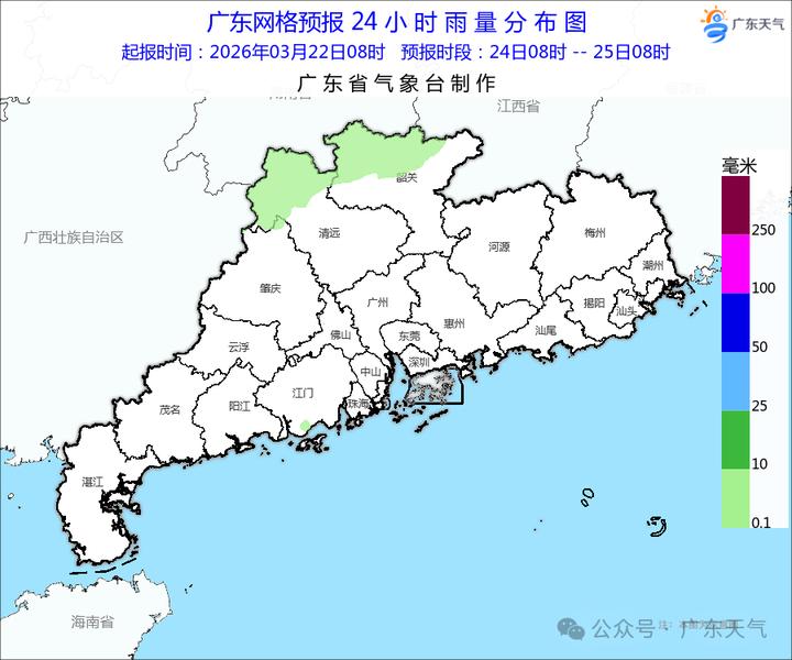 24日,韶关及清远的北部市县阴天间多云,有小雨,其余市县多云间阴天,有分散性零星小雨,早晚有轻雾或雾。最高气温:韶关、清远和粤东市县23~26℃,其余大部市县26~29℃。