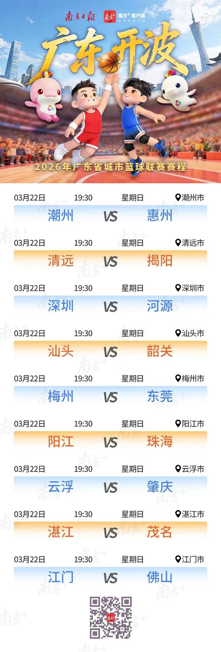 3月22日,2026年广东省城市篮球联赛(粤BA)首轮9场赛事同时开打,不仅要比各地篮球水平,各大主场更是拿出看家“好物”一争高低。关注南方+直播,可观看普通话、粤语、潮汕话、客家话多语解说,用自家方言为家乡球队撑腰。