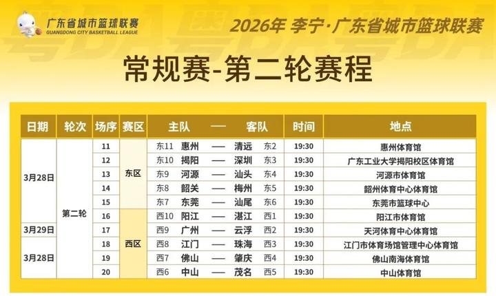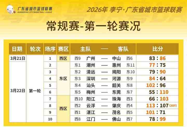 3月21日至22日,2026年广东省城市篮球联赛(粤BA)首轮常规赛全面开赛。除首轮轮空的汕尾队外,其余20支参赛队伍已经一一亮相。