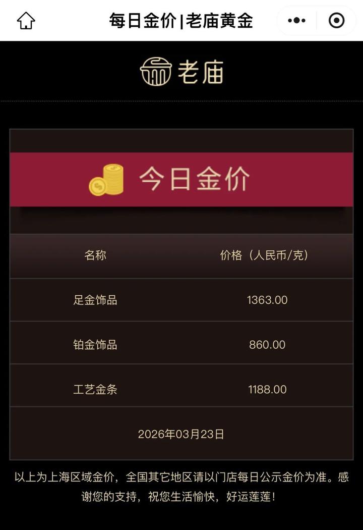 今早,多品牌纷纷调整足金饰品价格,老庙黄金足金饰品报1363元/克,较前一日1413元/克跌50元。周大福、六福珠宝、潮宏基黄金价格均跌至1400元/克以下。