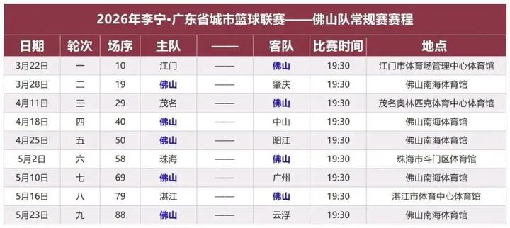 佛山队常规赛赛程。资料图