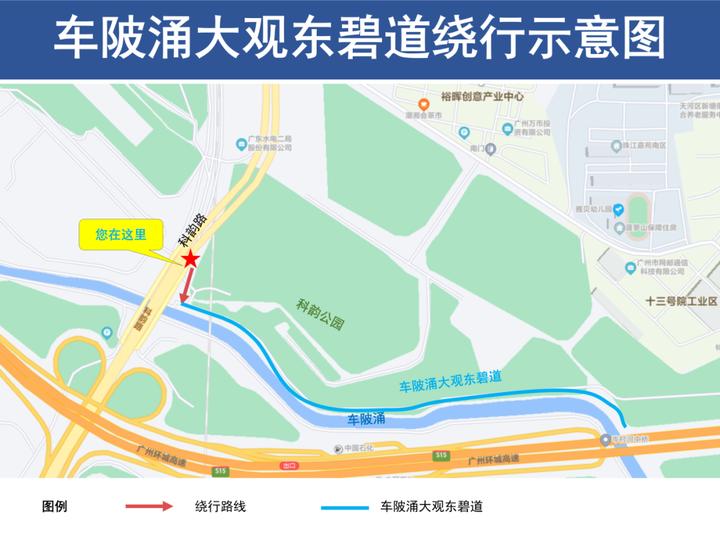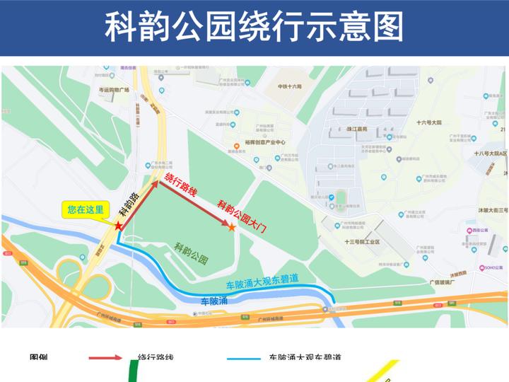 围蔽施工期间,请通往科韵公园的市民群众、过往车辆绕行科韵公园北侧道路(经园内道路可到达车陂涌碧道);具体绕行路径以现场指引为准。
