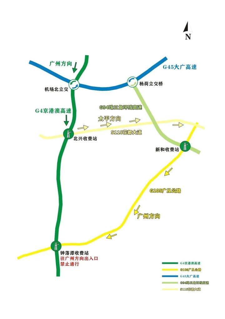 推荐路线:提前从北兴收费站驶离高速公路→S118花都大道往太平方向→G105广从公路往广州方向。