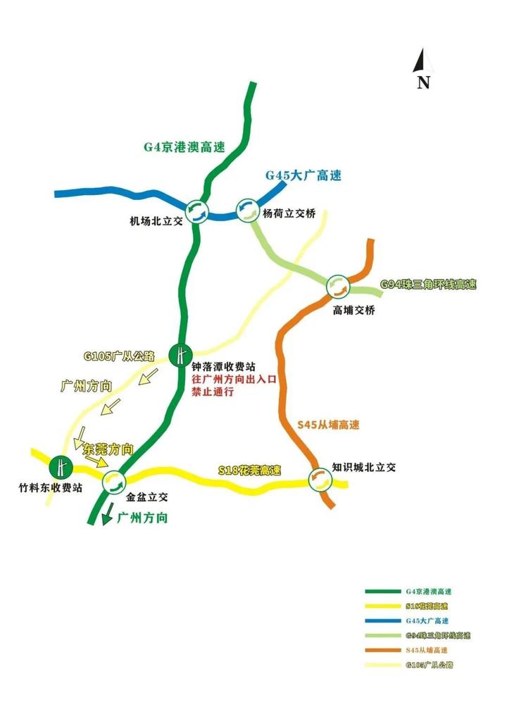 推荐路线:G105广从公路往广州→竹料东收费站→S18花莞高速往东莞方向→金盆立交→G4京港澳高速公路往广州方向行驶。