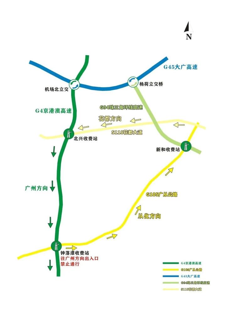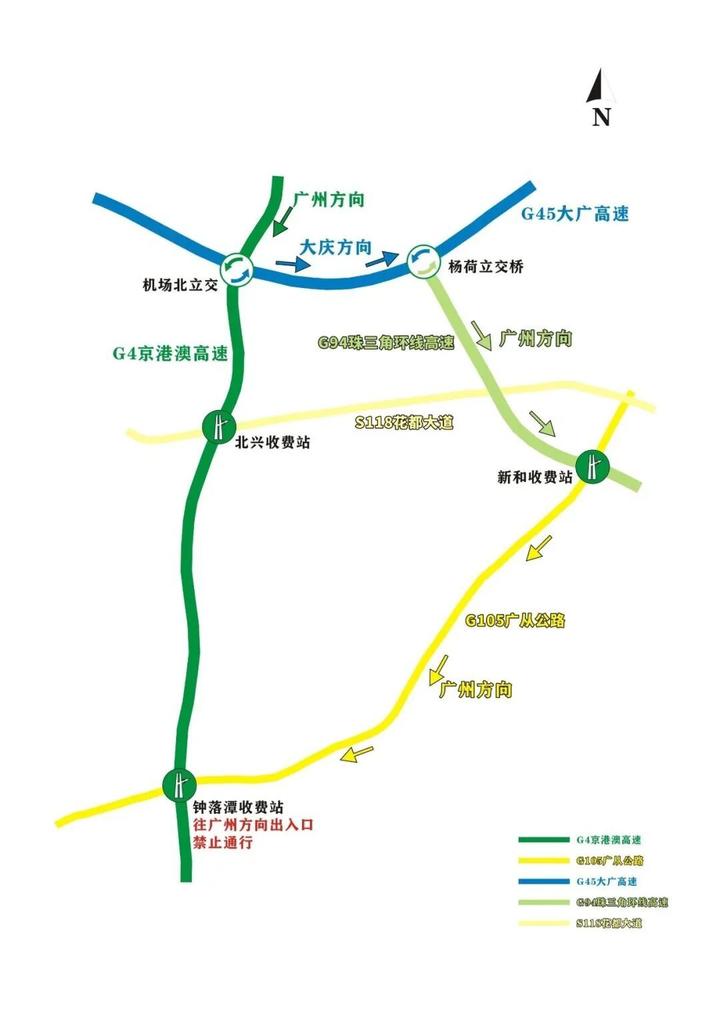 备选路线:提前从机场北立交转G45大广高速往大庆方向→杨荷立交→G94珠三角环线高速往广州方向→新和收费站→G105广从公路往广州方向。