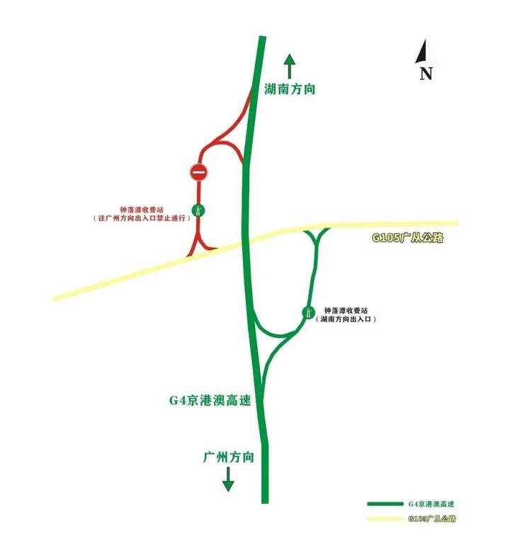 为保障G4京港澳高速公路粤境段改扩建工程(南段)施工顺利及过往车辆交通安全,现对G4京港澳高速公路钟落潭收费站(往广州方向)出入口匝道实施全封闭,开展收费站车道拓宽、重建改造等施工,预计2026年7月4日恢复通行。