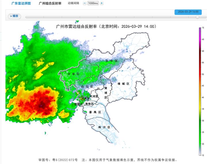 截至29日14时6分左右,从天气雷达回波图看,一片较大范围的雷雨云正从佛山方向移向广州。