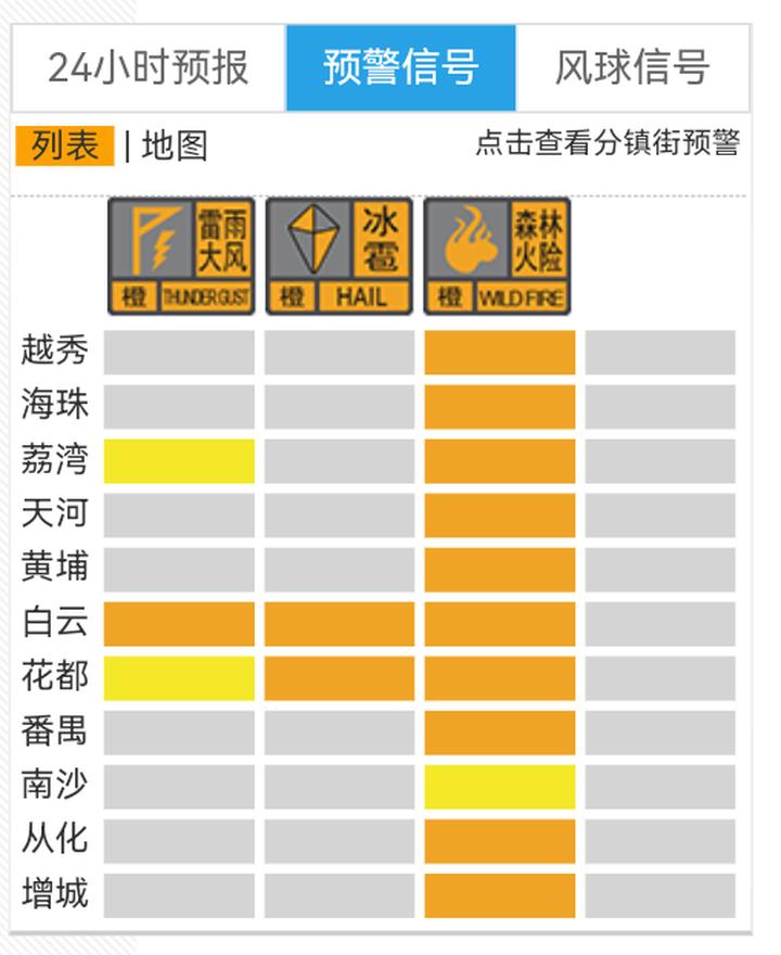 同时,广州白云、花都发布冰雹橙色预警;荔湾、花都发布雷雨大风黄色预警,白云发布雷雨大风橙色预警。