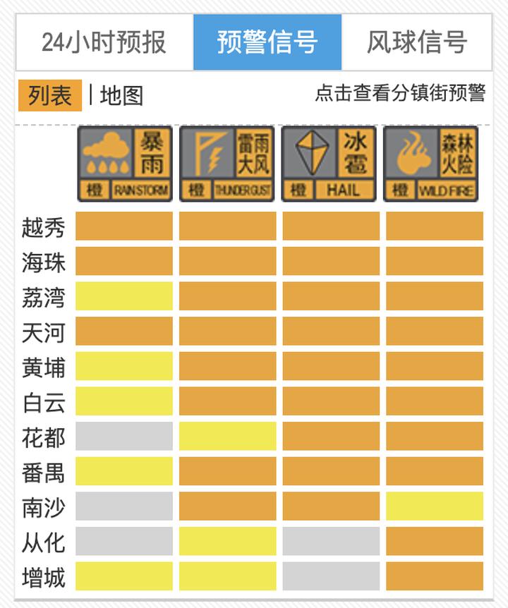 截至29日15时30分,越秀、海珠、天河,同时发布暴雨、雷雨大风、冰雹橙色预警信号;荔湾、黄埔、白云、番禺发布暴雨黄色、雷雨大风和冰雹橙色预警信号;南沙发布雷雨大风和冰雹橙色预警信号;花都发布雷雨大风黄色、冰雹橙色预警信号;增城发布暴雨和雷雨大风黄色预警信号;从化发布雷雨大风黄色预警信号。