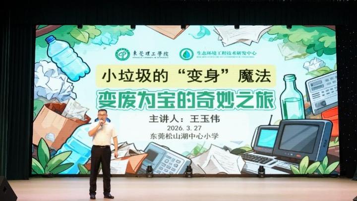 为引导孩子们树立环保理念,3月27日,东莞松山湖中心小学迎来了一场趣味十足的环保科普讲座。东莞理工学院生态环境工程技术研发中心副研究员王玉伟以《小垃圾的“变身”魔法》为题,为该校二年级约600名师生带来了一堂生动的固体废弃物资源化主题科普课。