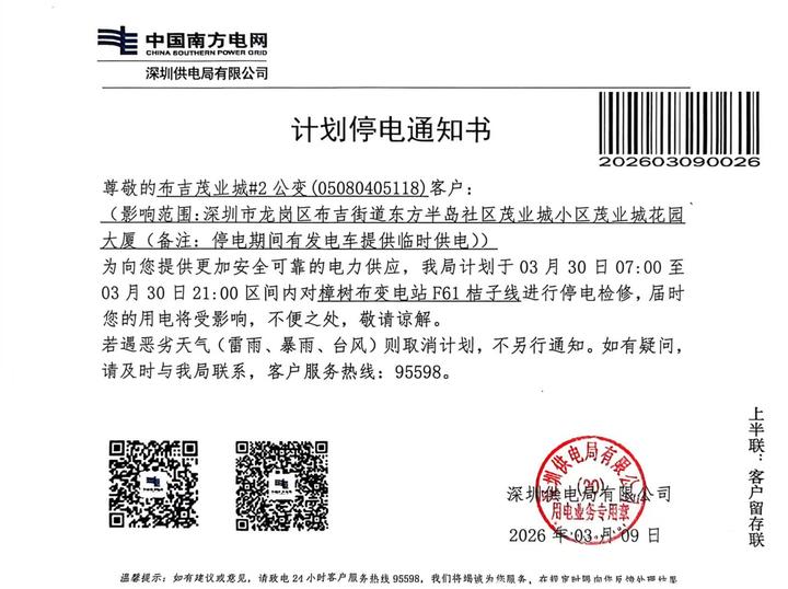 但据陈女士反映,在工程施工前,物业并未告知业主。仅于3月9日张贴了一张由深圳供电局有限公司出具的《计划停电通知书》,内容仅表示将对樟树布变电站F61桔子线进行停电检修,未提及重新铺设电缆及施工问题。“施工方既未提前公示施工图纸,也未提供施工许可证,完全是在业主不知情的情况下擅自开展施工的。”陈女士补充道,茂业城花园大厦目前尚未成立业主委员会,这也给业主们的维权带来了一定不便。