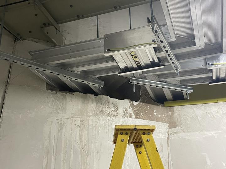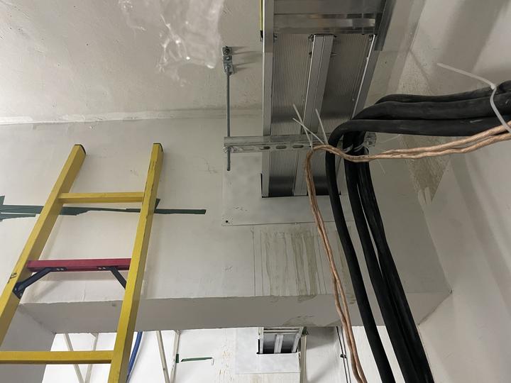 3月31日下午,深圳特区报&读特记者前往现场看到,施工点位于花园大厦地下一层的机房内,打洞的墙体外已用塑料遮蔽住原有空洞,仅可见金属钢槽穿墙而过。现场已停工,留有多个液压千斤顶,有工作人员在附近休息。