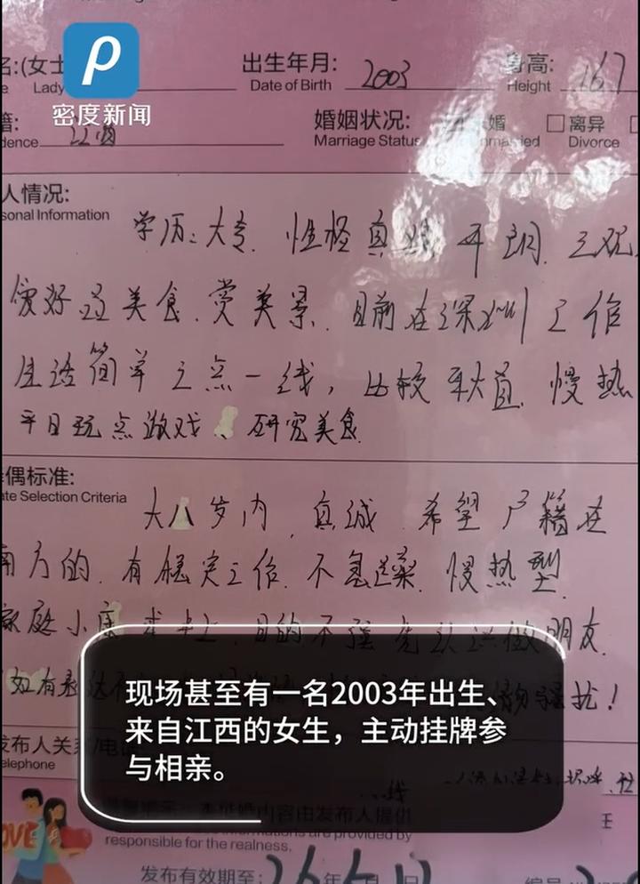 有媒体到现场发现,不少00后已扎堆进驻相亲角,在1990年及以后出生女士男士专区,多张00后个人信息牌格外显眼,甚至有03年来自江西的女生主动挂牌相亲。