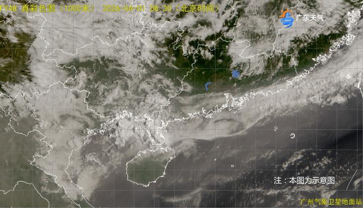 今天(4月1日)广东转受高空槽后偏西北气流控制,从今晨的卫星云图来看,除西南部仍有对流云团覆盖,其余大部地区可见阳光,今明两天全省大部以多云天气为主,部分市县有雷阵雨。