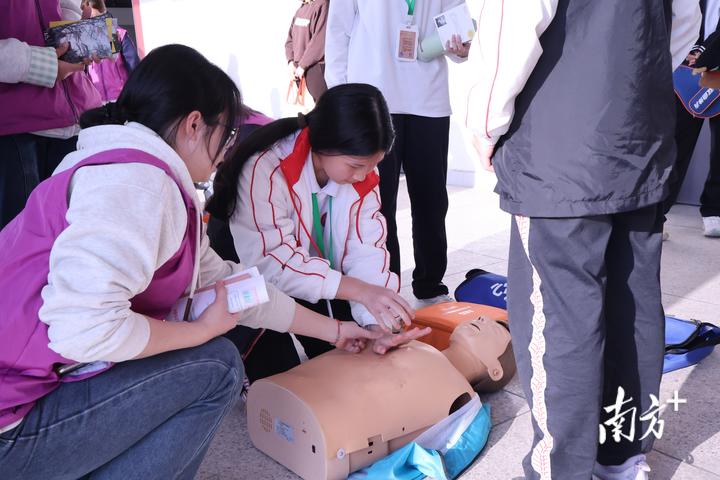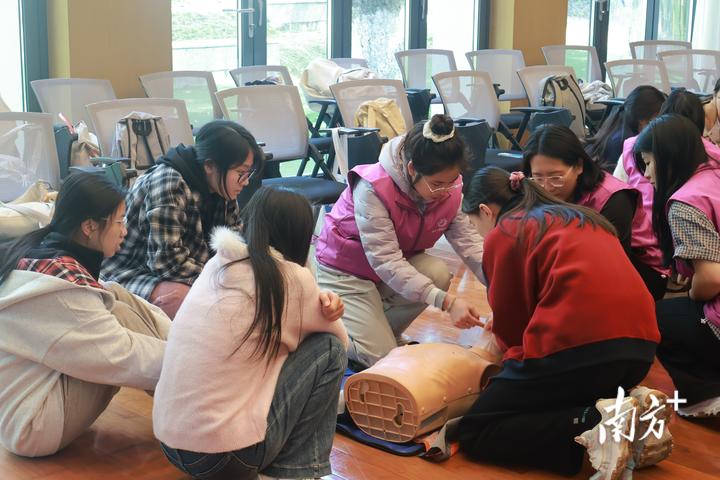 “按压时双手交叠,掌根对准胸骨下半部,深度保持5—6厘米,频率控制在每分钟100—120次,切忌用手臂蛮力!”近日,在汕头市第二中学的课堂上,汕头大学淑德书院女子急救科普志愿队的志愿者们正手把手指导学生进行心肺复苏实操训练。