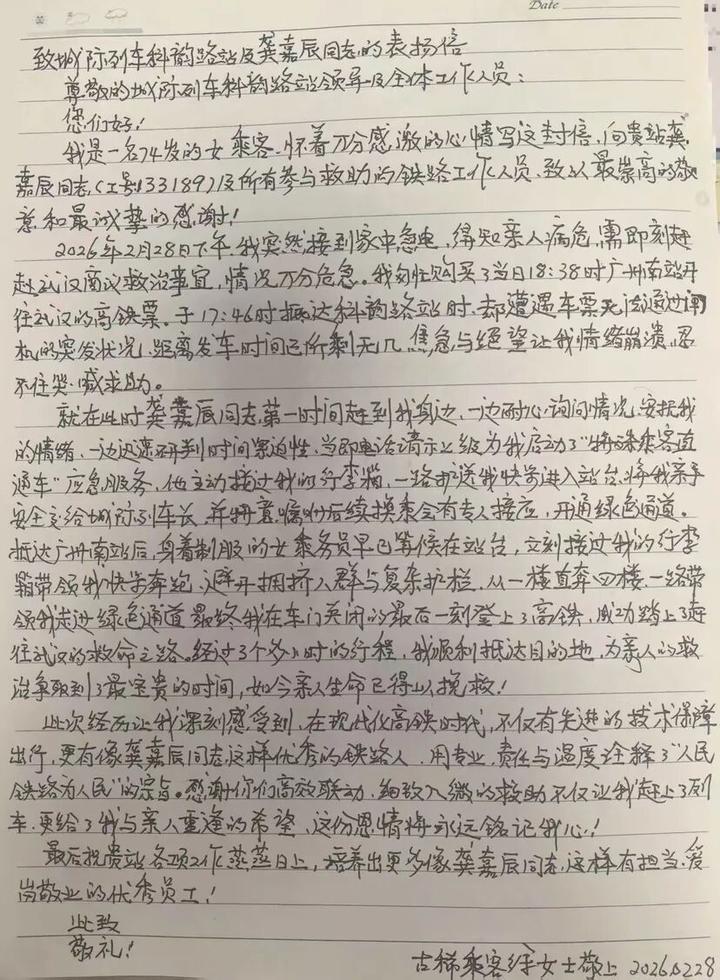 事后,徐女士专程返回城际科韵路站,亲手递交手写感谢信,为广东城际工作人员专业高效、暖心担当的服务点赞。她在信中写道,正是城际工作人员在关键时刻挺身而出,让自己在最无助时感受到温暖与力量。