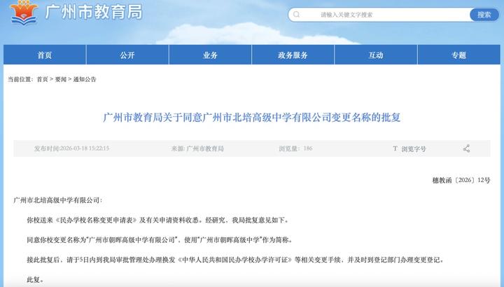 近日,广州市教育局官网发布《广州市教育局关于同意广州市北培高级中学有限公司变更名称的批复》。