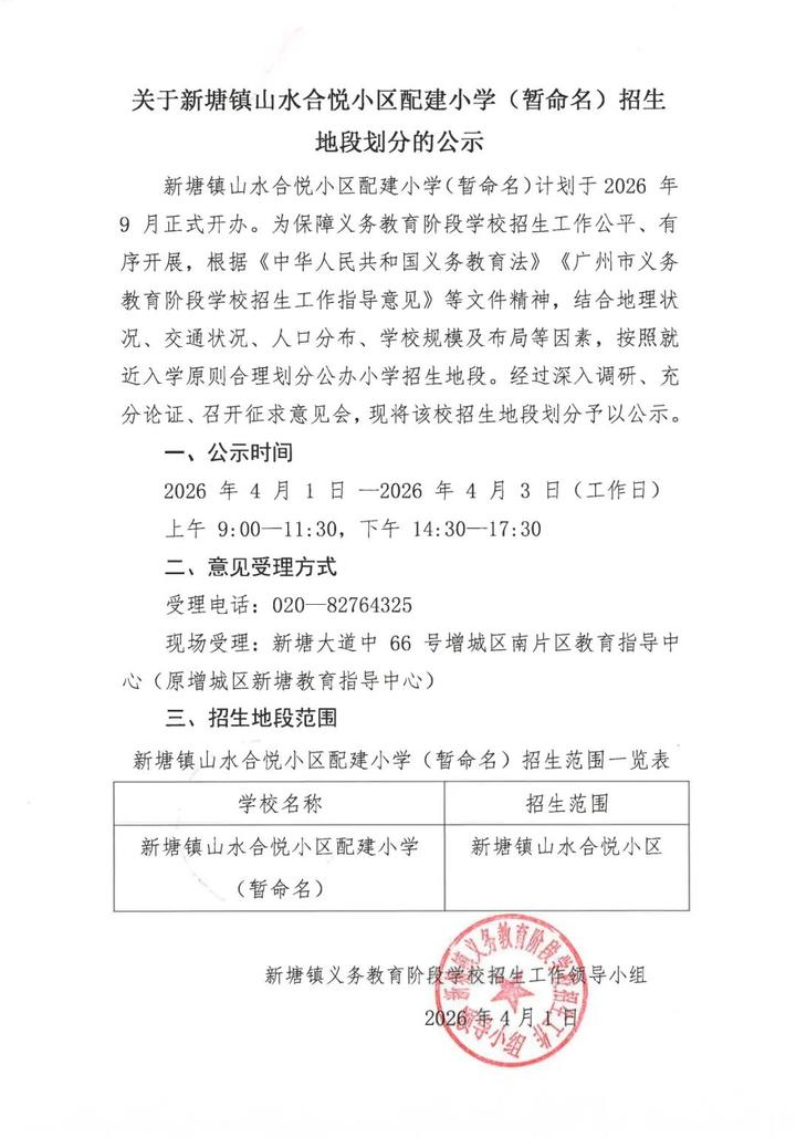 日前,新塘镇义务教育阶段学生招生工作领导小组发布《关于新塘镇山水合悦小区配建小学(暂命名)招生地段划分的公示》,明确该校9月正式开办,公示招生范围为新塘镇山水合悦小区。