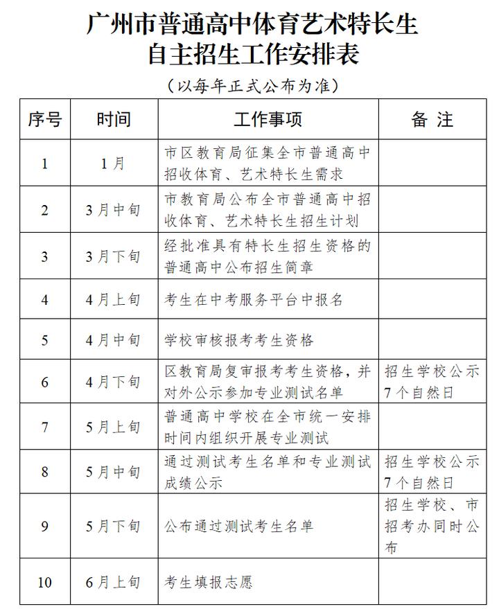 广州市招生考试委员会办公室提醒,有意报考特长生计划的考生,须按特长生招生工作日程安排,在规定时间内登录中考服务平台完成网上申报,在平台打印《特长生报名表》,连同相关获奖证书等材料到特长招生学校现场确认。已申报特长生的考生,不能再申报或变更跨区生资格。
