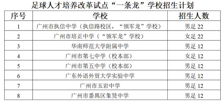 足球人才培养改革试点“一条龙”学校招生计划男足82个,女足34个,招生学校包括广州市执信中学(执信路校区)、广州市培正中学等8所学校。