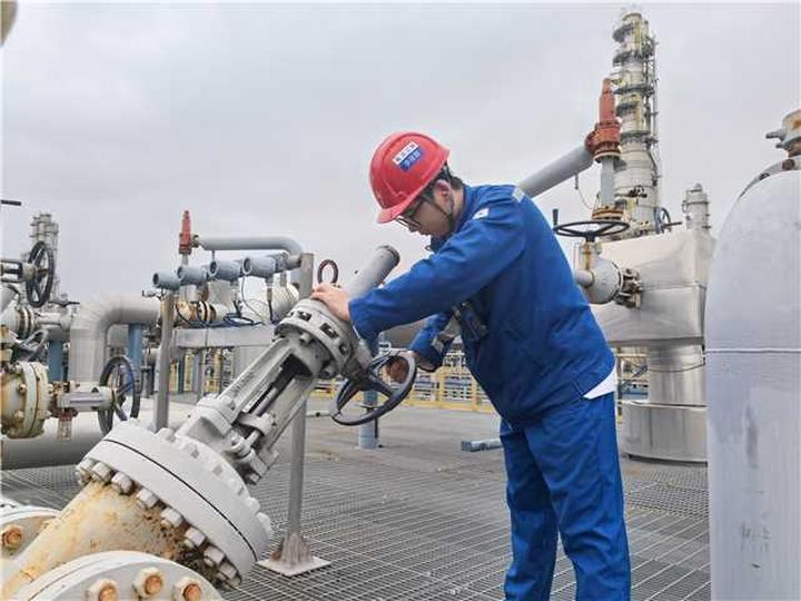 图为广东石化80万吨/年全密度聚乙烯装置聚合外操李昊霖手动调整异戊烷阀门