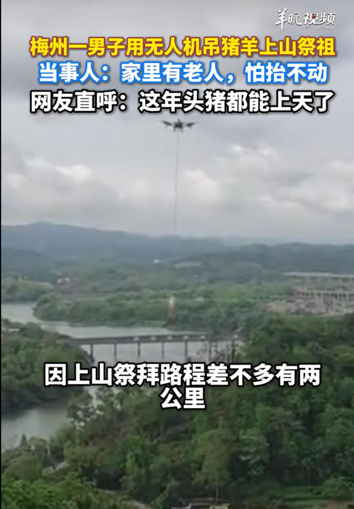 近日,广东梅州一男子因清明祭祖时采用无人机吊运几百斤的猪羊上山,引发网友热议。