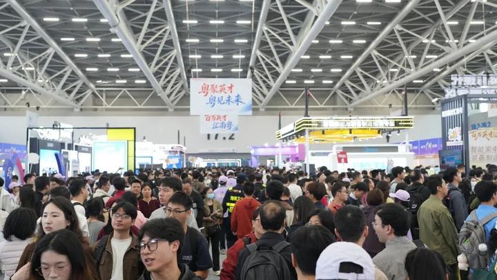 招聘会现场人流如织、气氛热烈。