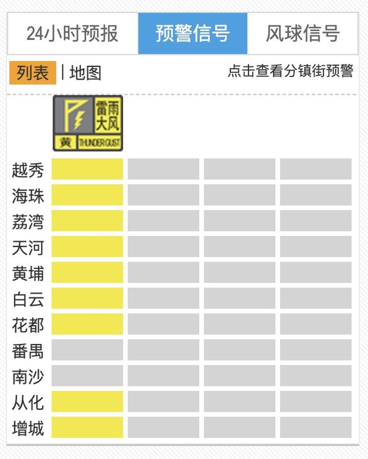 截至下午5时许,除番禺和南沙外,越秀、海珠、荔湾等多区发布雷雨大风预警信号。预计雷雨仍将影响1—3小时,请注意防御雷电、短时强降水、短时大风等强对流天气及其引发的次生灾害。