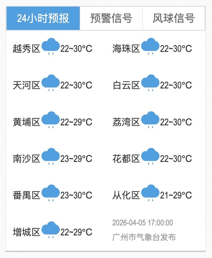 据广州市气象台消息,未来24小时广州市各区仍是降水天气,气温介于22℃至30℃。