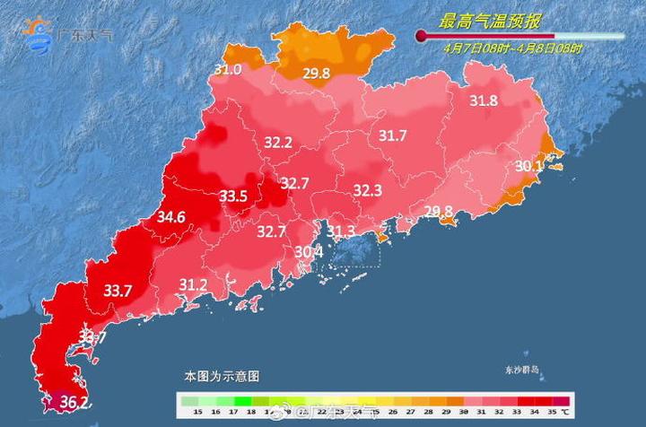7-8日,粤北、珠三角北部市县多云,有分散(雷)阵雨,其余市县多云到晴。白天最高气温:雷州半岛34-36℃,粤西其余市县和珠三角市县30-34℃,其余市县26-30℃。