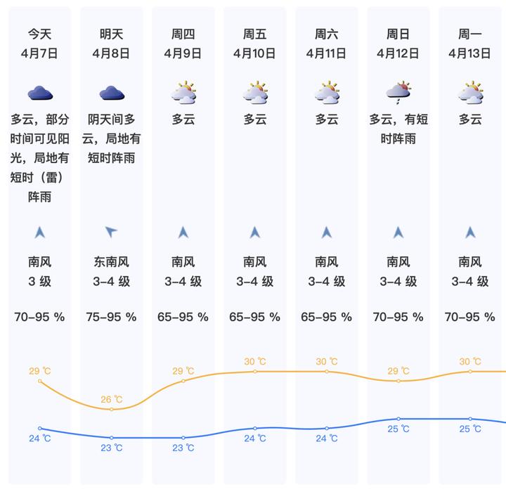 7日多云,局地偶有短时阵雨,气温24-29℃;
