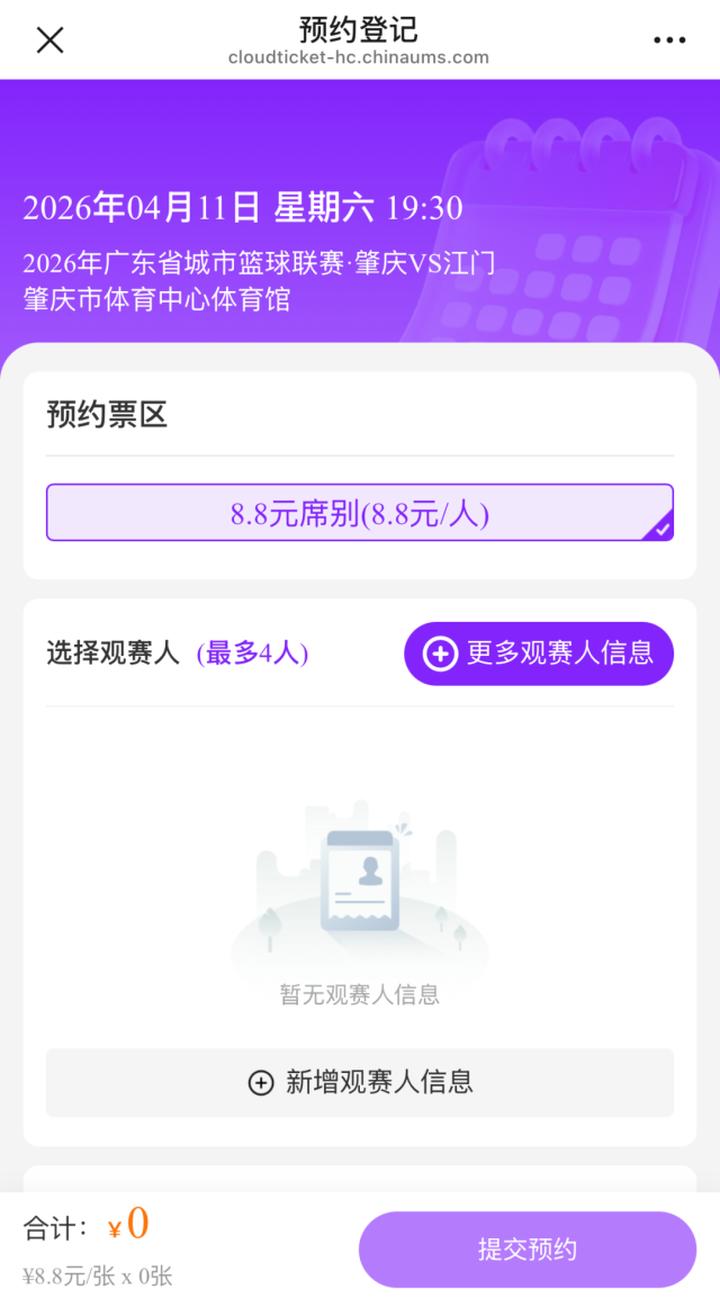 本轮赛事票价统一8.8元,球迷朋友可以关注“广东篮球-粤BA”公众号,点击主页“粤BA购票”专栏,进入票务预约系统,选择要观看的比赛场次,提交报名预约。